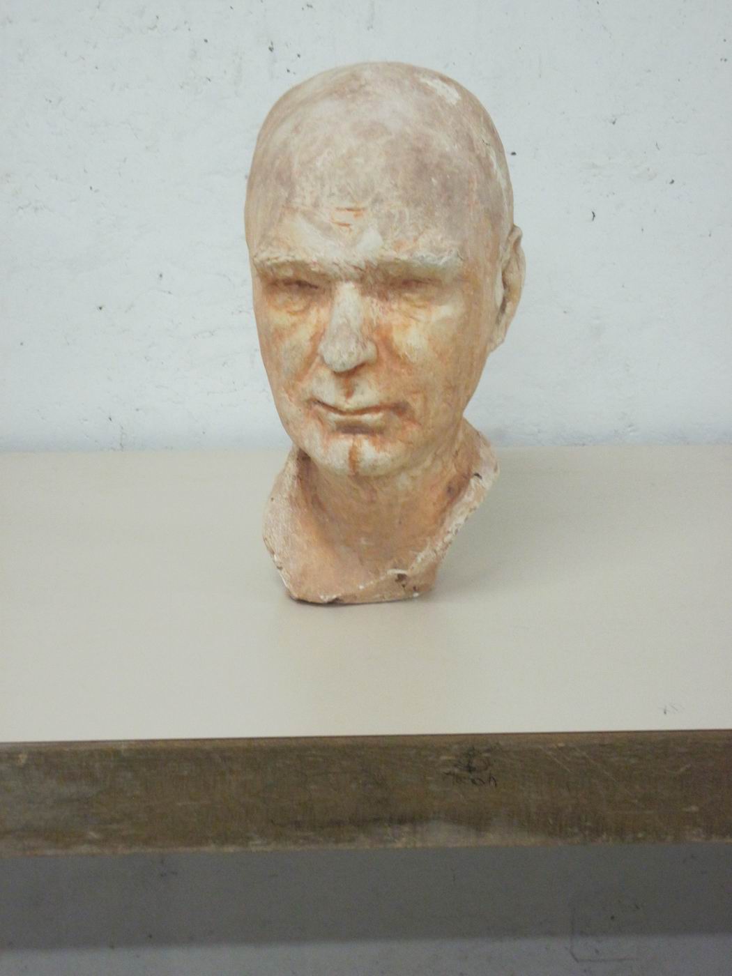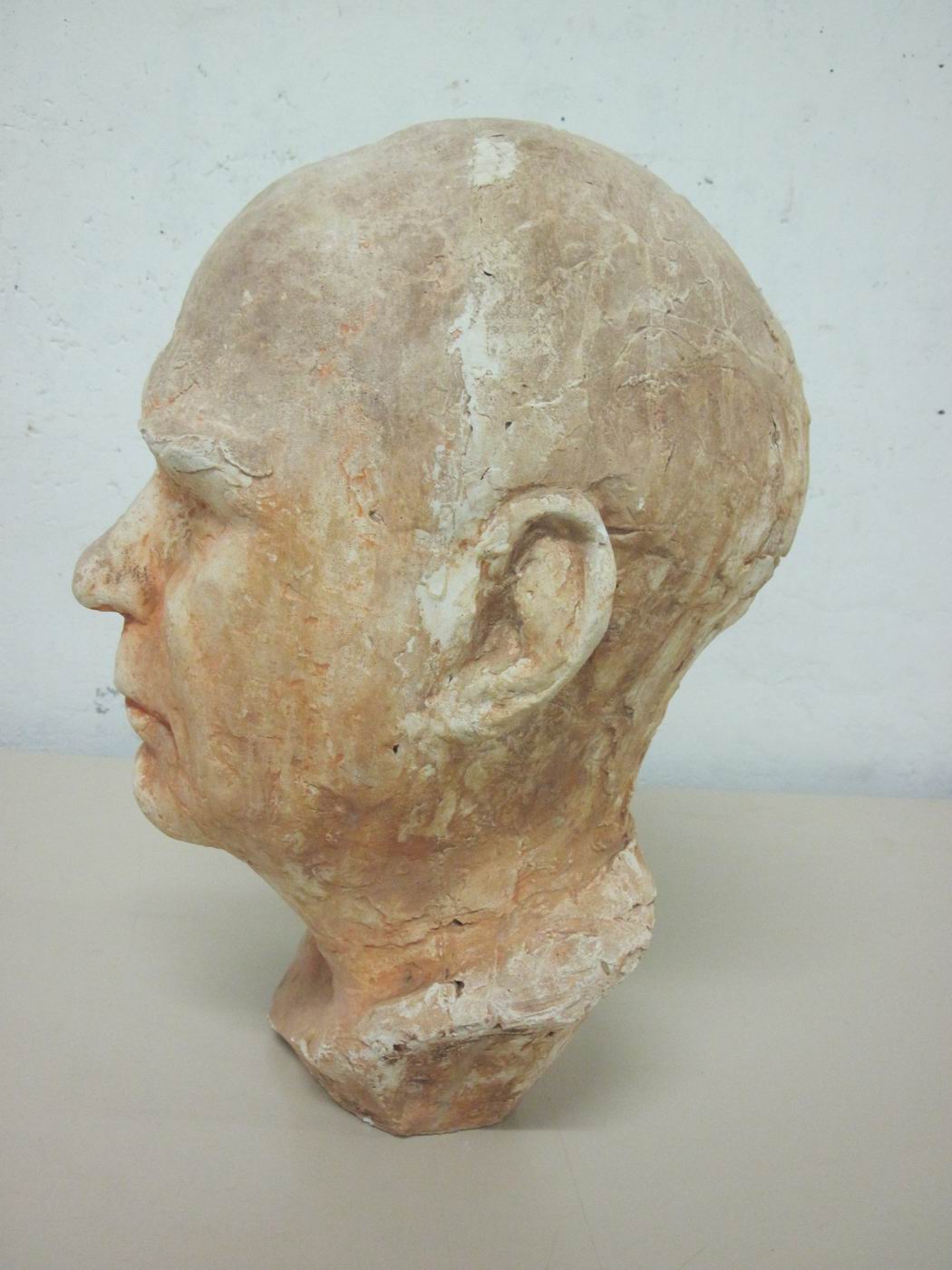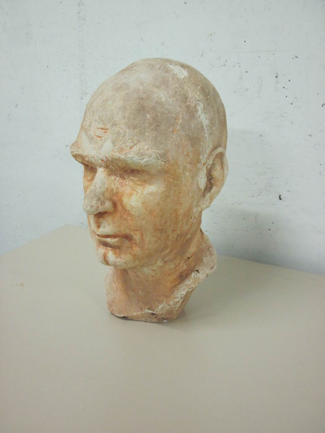 Nach Aussage von Anwesenden, welche anlässlich der Herstellung der gezeigten Fotoaufnahmen mit Restaurationen am Ort der Aufnahmen beschäftigt waren, handelt es sich hier um den Kopf eines Unbekannten, welcher angeblich beim Modellieren bei Probst in Peney in der Nähe von Genf nicht still sitzen konnte und dann diesen Kopf auch nicht entgegennehmen, nicht haben und nicht behalten wollte, worauf ihn angeblich eine öffentliche Institution geschenkt bekam, welche ihn jetzt zu ihrer Sammlung zählt. Dies sei vermutlich um 1963 geschehen (anlässlich der Auswahl von Großplastiken für größere öffentliche Gebäude in Dreiland). Unglaublich, wie Probst es geschafft hat, dem Material eine Psyche einzuhauchen, so dass es scheint, im Gips sein noch Leben drin! Es handelt sich bei der Figur um eine Großausführung in etwa drei bis vierfacher natürlicher Größe. (Probst soll nach der Aussage eines Anwesenden angeblich bemerkt haben: "Damit man ihn nicht übersieht.") Probst hat viele Großfiguren geschaffen. Ist eine große Figur einfacher zu machen - oder schwieriger - als eine kleine Figur? |