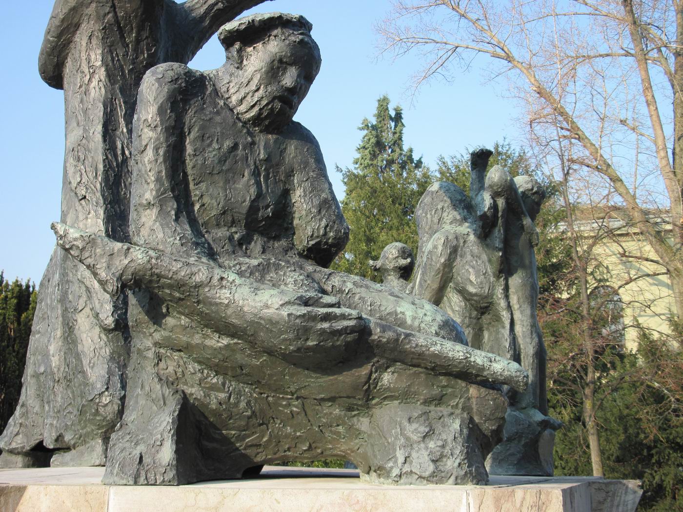 Dreigegliedert in Schutzengel (auch als Erzengel Gabriel beschrieben), Mutter mit Kindern (auch Hungernde) und sterbender Krieger