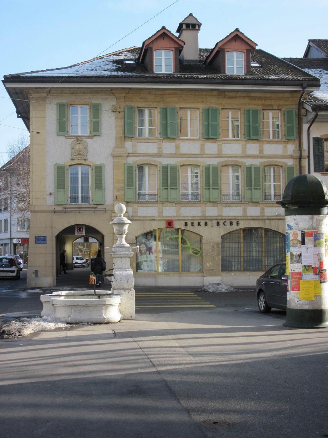 Das Gebäude der Berner Kantonalbank in Nidau ist erwähnt im Schweizerischen Kunstführer Nidau sowie in der Reihe über die Kunstdenkmäler der Schweiz. Das Haus mit der Barockfront von 1714 besaß bis etwa 1916 straßenseitig einen Anbau, der einige Meter in die heutige Strasse hinein ragte und zu der genannten Zeit der Strasse Platz machen musste. Der Anbau wurde damals weggerissen und durch einen Erweiterungsbau des Barockgebäudes mit Arkaden über dem Trottoir ersetzt. Jakob Probst bekam 1916 den Auftrag, eine Kunststeinkartusche mit dem Stadtwappen von Nidau zu liefern (Symbole Krebs und Fisch wie unten gezeigt, heraldische Farbe der Symbole rot). Das Wappen ist oben überhöht durch einen Frosch. Ebenso ist es unten unterlagert durch zwei Frösche. Frosch ist der Neckname der Nidauer. Im heute noch existierenden, an der Fassade des Anbaus von 1916 zum Barockgebäude angebrachten Wappen sind die Wappensymbole in Gold gehalten. Die Wappenfarbe Gold bedeutete früher eine große, nur durch den Kaiser oder den Papst verliehene Ehre. Nach der Reformation und besonders nach der auch in die heutige Schweiz exportierten französischen Revolution verlor die höchste Obrigkeit die Ehre, Ehrenzeichen verleihen zu können, weil die Untertanen diese Ehre nicht mehr anerkennend wahrnahmen. Daher werden die alten Wappenregeln heute oft nicht mehr beachtet. Manchmal sieht man, dass sogar früher unmögliche, unstatthafte Farben wie braun darin verwendet werden. |
