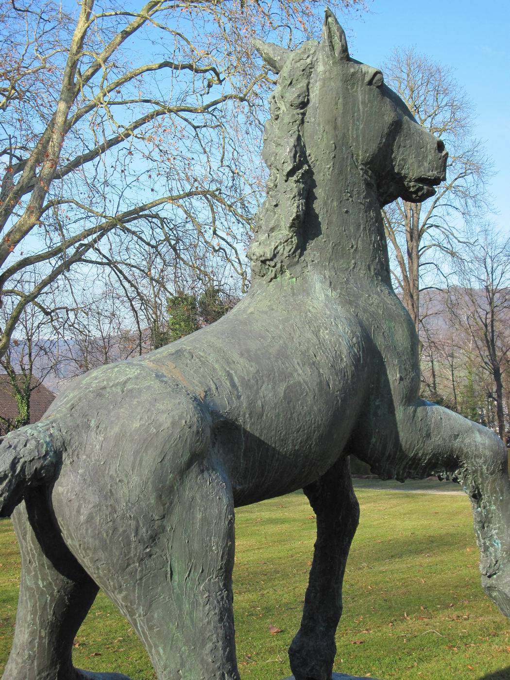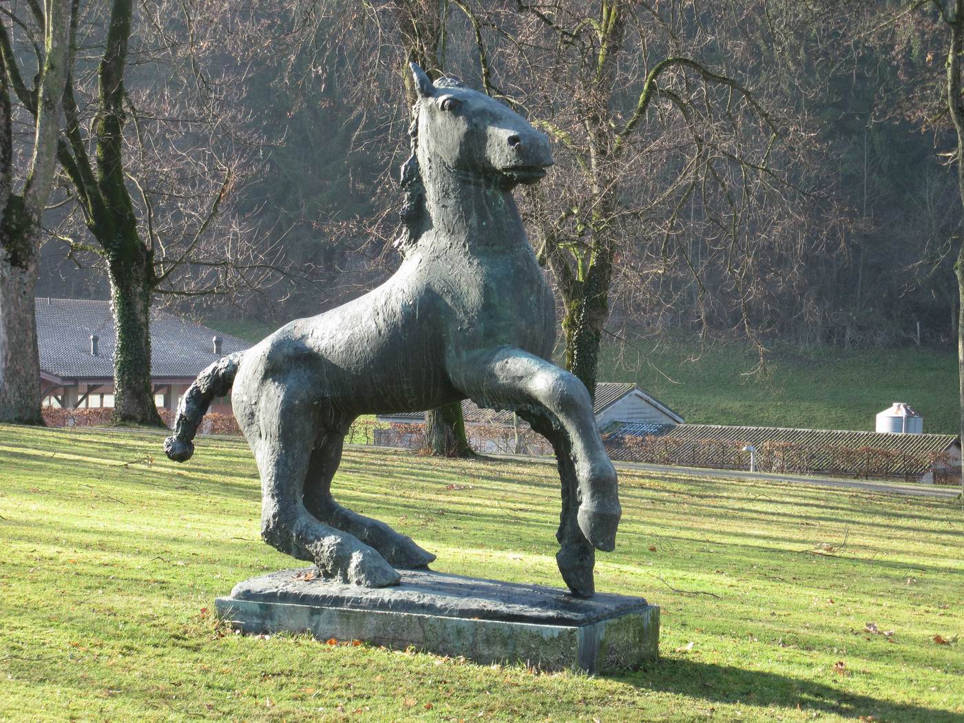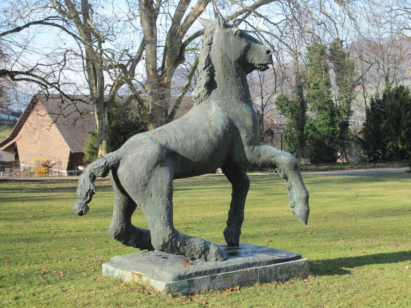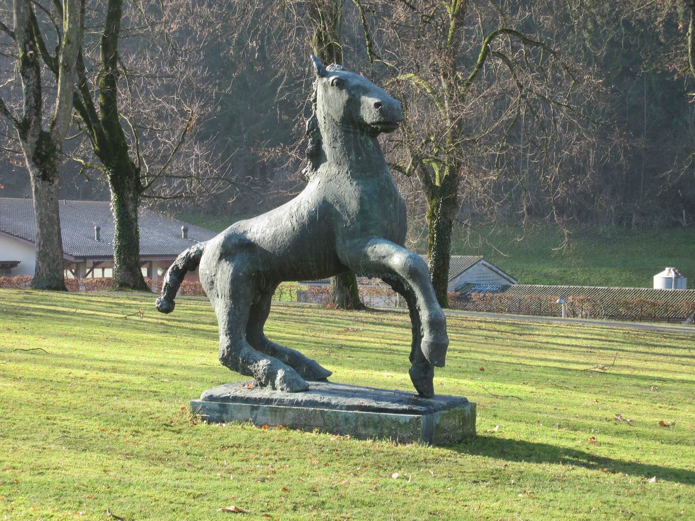 1965: Der Kanton Baselland beschließt am 13.9.1965 eine Ehrenausstellung im Schloss Ebenrain (Sissach) zu Ehren des am 17.8. 1965 nun 85 Jahre alt gewordenen Bildhauers Jakob Probst durchzuführen. Zum Anlass dieser Ehrung sprach der Kanton einen Kredit von damals sFr. 60'000.- für den Ankauf des Puledro (überlebensgroßer jungen Hengst, Bronze, gegossen in Mendrisio) zur längst fälligen Ausschmückung des Kantonsspitals. Das Geld wurde gesprochen für den künstlerischen Wert, den Guss des Werkes, den Transport nach Liestal, die Aufstellung (Anm.: damals) in der genannten Anlage. Damals konnte man sich für diese Summe auf dem Lande ein Einfamilienhaus kaufen. |