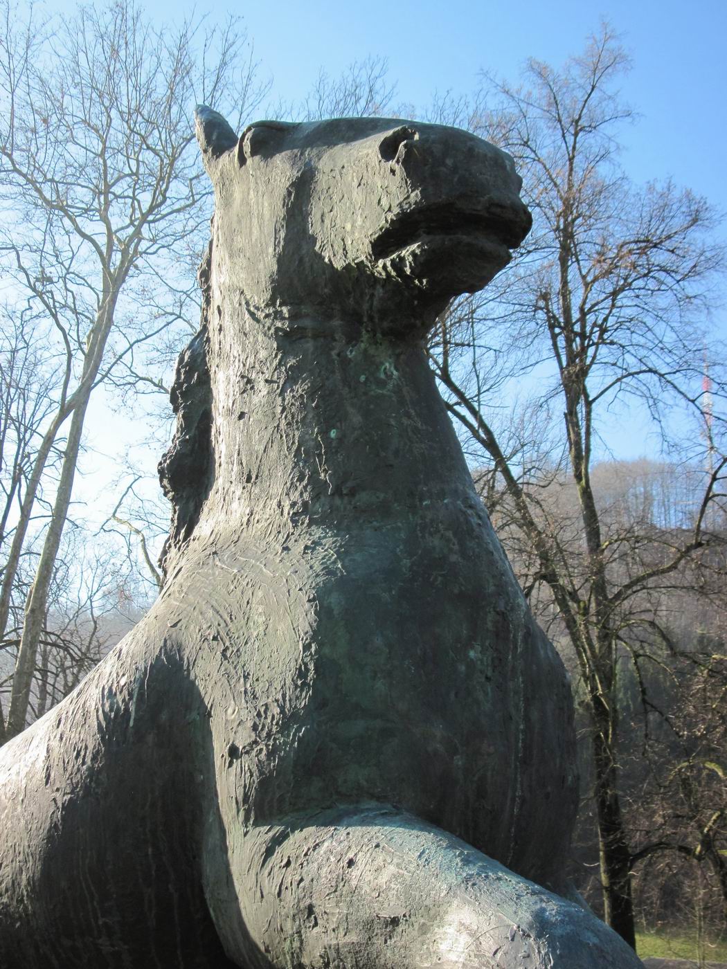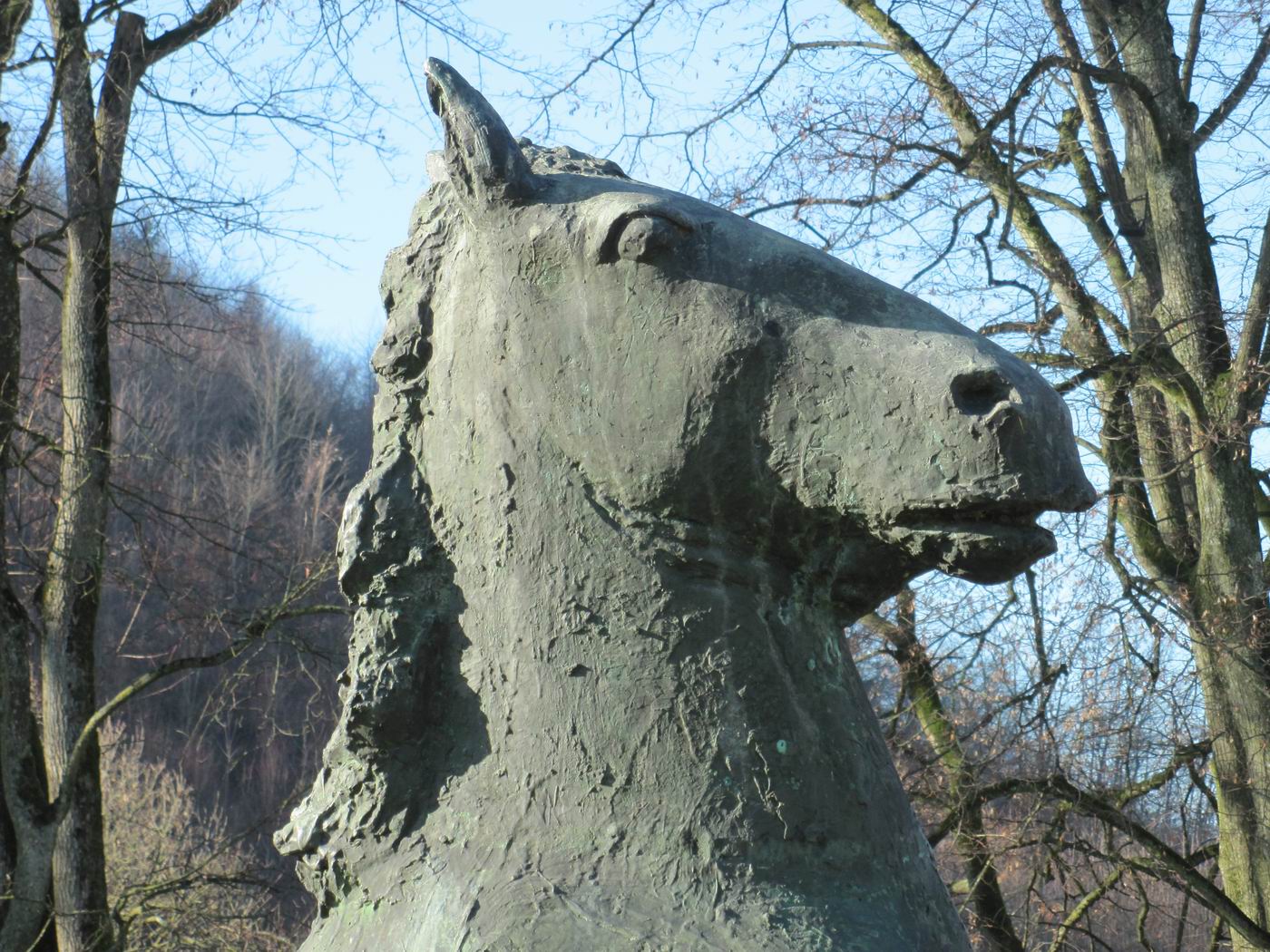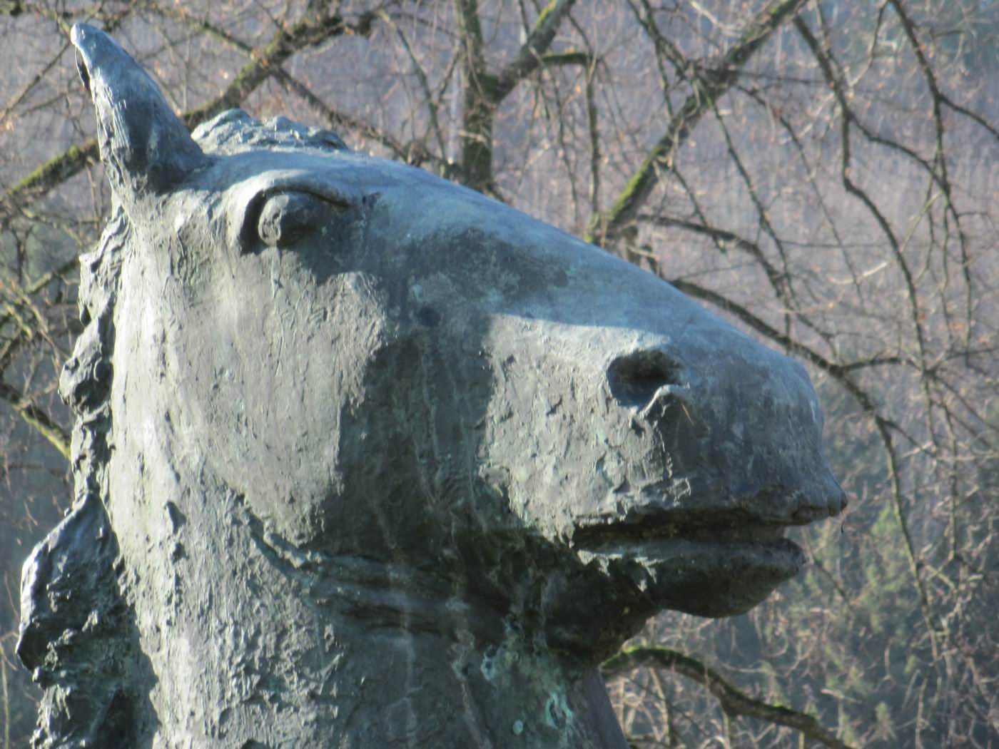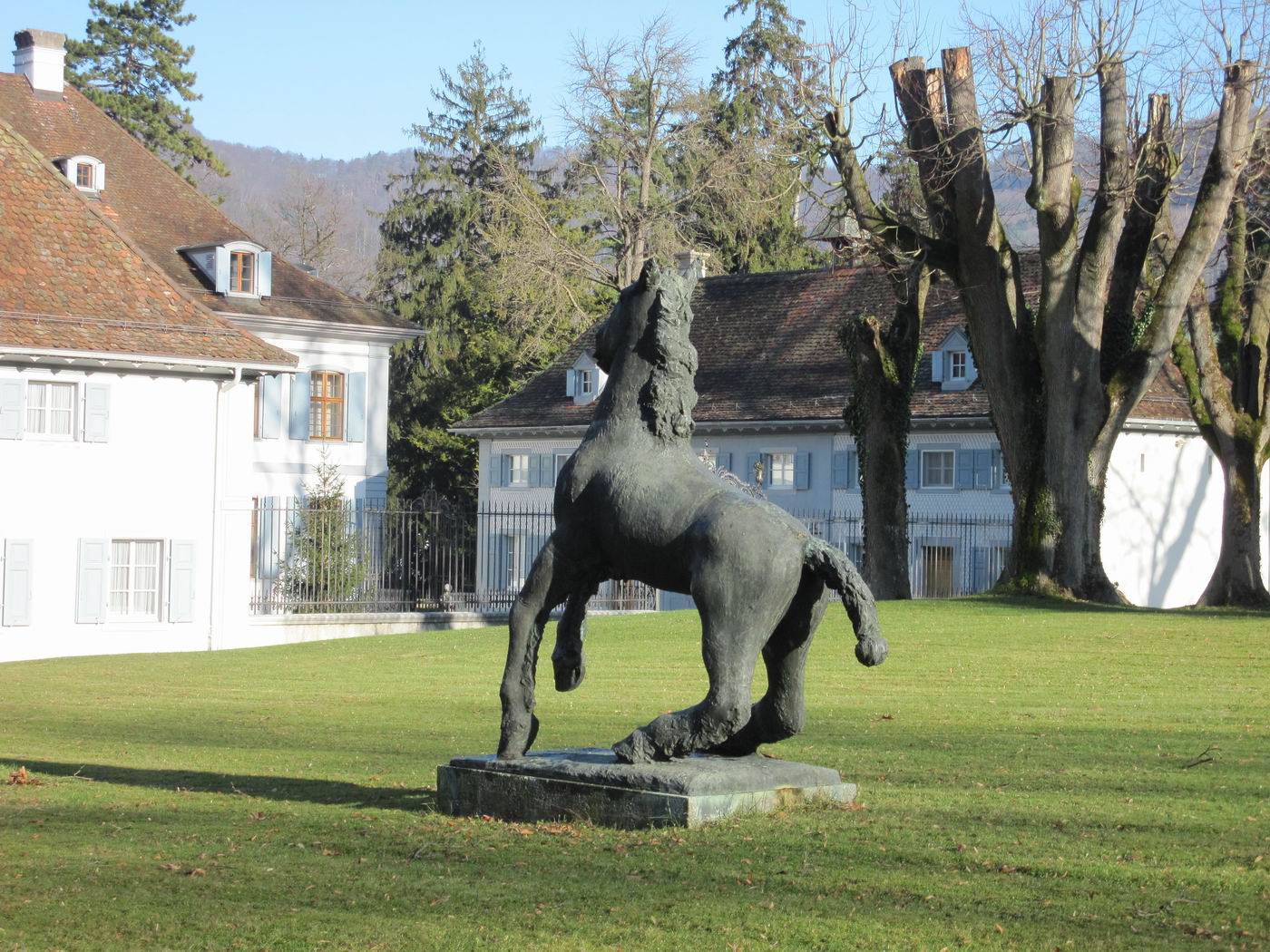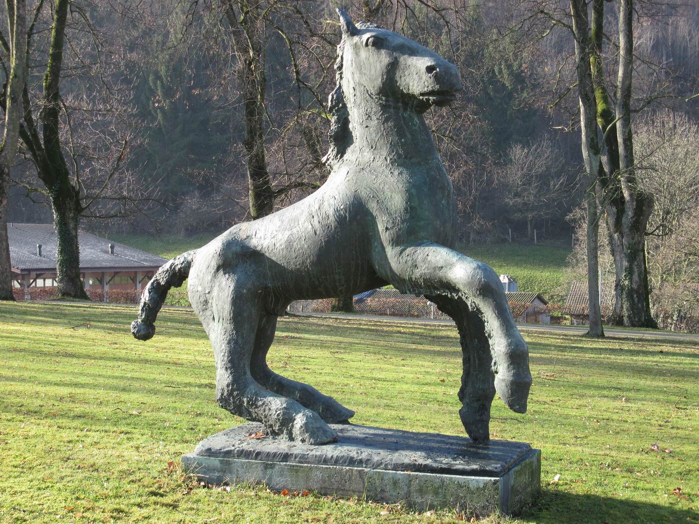 1965: Der Kanton Baselland beschließt am 13.9.1965 eine Ehrenausstellung im Schloss Ebenrain (Sissach) zu Ehren des am 17.8. 1965 nun 85 Jahre alt gewordenen Bildhauers Jakob Probst durchzuführen. Zum Anlass dieser Ehrung sprach der Kanton einen Kredit von damals sFr. 60'000.- für den Ankauf des Puledro (überlebensgroßer jungen Hengst, Bronze, gegossen in Mendrisio) zur längst fälligen Ausschmückung des Kantonsspitals. Das Geld wurde gesprochen für den künstlerischen Wert, den Guss des Werkes, den Transport nach Liestal, die Aufstellung (Anm.: damals) in der genannten Anlage. Damals konnte man sich für diese Summe auf dem Lande ein Einfamilienhaus kaufen. |