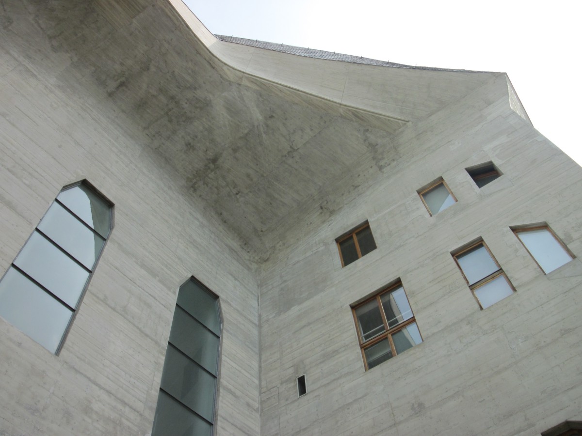 • Dieses 2. Goetheanum ist ein "Stahl-Beton-Riegelbau" mit Betonwänden von nur 8 cm Dicke zwischen den Beton-Balken, also kein "Bunker-Bau".